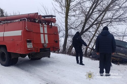 Порятунок: Поліцейські не проїхали повз. Об’єднавши зусилля з працівниками ДСНС, вони за допомогою спецтехніки та підручних засобів повернули транспортний засіб на проїжджу частину.