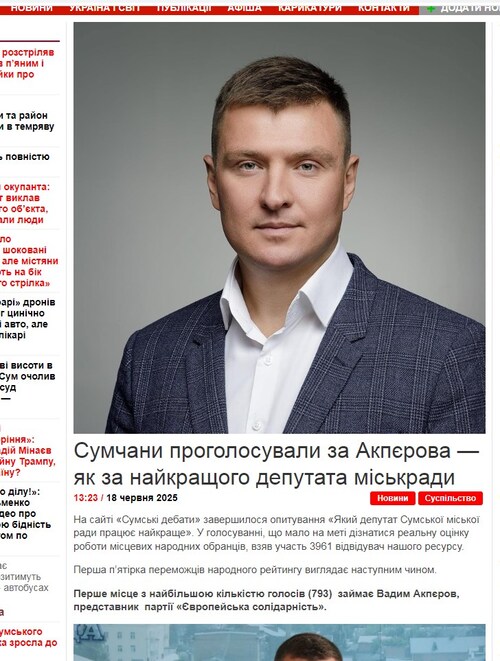 Тепер же, коли фінансування від ОПЗЖ для сайту «Сумські дебати» припинилося, нішу клієнтів, що пустує, скоріш за все зайняв лідер “Європейської солідарності” в місті Суми Вадим Акпєров.