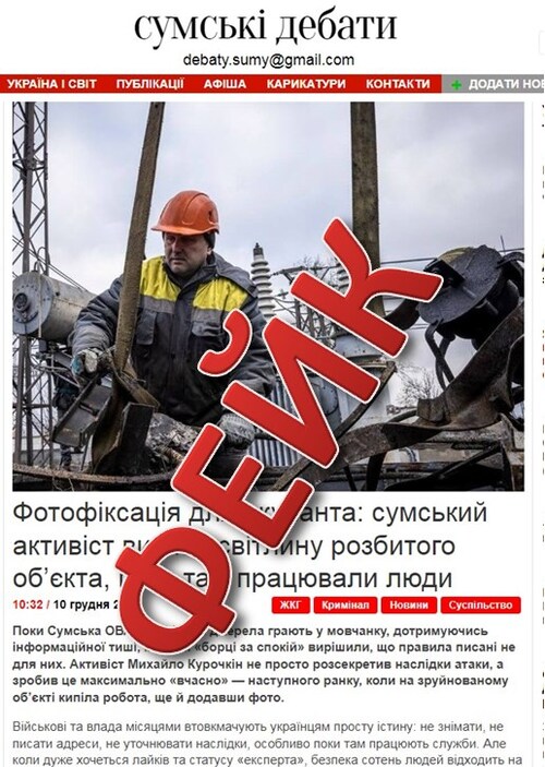 Автор публікації на «Сумських дебатах» стверджує, що Михайло Курочкін у своєму дописі у Facebook від 9 грудня “розсекретив наслідки атаки в Сумах”, зробивши це “максимально «вчасно» — наступного ранку, коли на зруйнованому об’єкті кипіла робота, ще й додавши фото”.