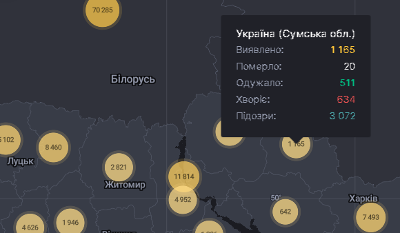 Як повідомляє система моніторингу поширення епідемії коронавірусу, на Сумщині станом на 9:00 22 серпня виявлено 1165 випадків COVID-19, з них +20 за останню добу. 511 пацієнтів одужали, 634 все ще хворіє. Від ускладнень коронавірусної хвороби померло — 20 мешканців області