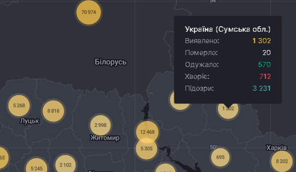 Як повідомляє система моніторингу поширення епідемії коронавірусу, на Сумщині станом на 9:00 27 серпня виявлено 1302 випадки COVID-19, з них +33 за останню добу. 570 пацієнтів одужало, 712 все ще хворіє. Від ускладнень коронавірусної хвороби померло — 20 мешканців області.
