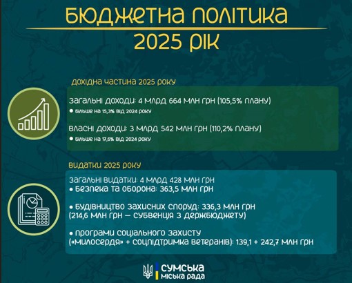 За підсумками 2025 року дохідна частина бюджету Сумської МТГ виконана в обсязі 4 664,1 млн грн, що становить 105,5% до затвердженого річного плану та на 618,9 млн грн (15,3%) перевищує показник 2024 року. Власні доходи склали 3 542,1 млн грн (110,2% до плану), що на 531,2 млн грн (17,6%) більше порівняно з надходженнями 2024 року.