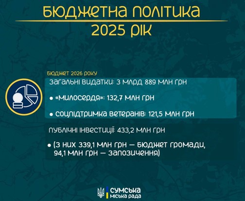 Загальний обсяг видатків бюджету Сумської міської територіальної громади на 2026 рік визначено у сумі 3 889,0 млн гривень. Пріоритети бюджетної політики залишаються незмінними та зосереджені на аспектах безпеки і оборони, соціального захисту жителів, освіти, забезпечення функціонування та захисту критичної інфраструктури, будівництва захисних споруд, відновлення пошкоджених об’єктів житлового фонду та соціально-культурної сфери.