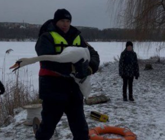 На озері Чеха в Сумах відбулася рятувальна операція з порятунку лебедів, які через різке зниження температури опинилися серед криги та втратили можливість безпечно перебувати на водоймі.