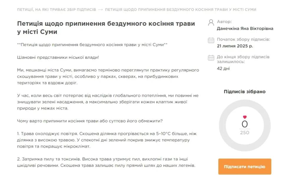 Ми, мешканці міста Суми, вимагаємо терміново переглянути практику регулярного скошування трави у місті, особливо у парках, скверах, на прибудинкових територіях та вздовж доріг.