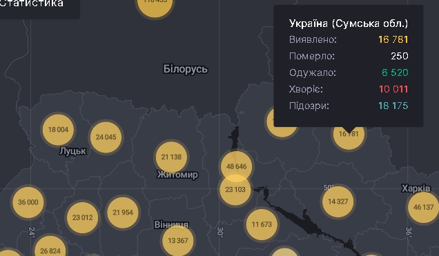 Як повідомляє система моніторингу поширення епідемії коронавірусу РНБО України, на Сумщині станом на 8:50, 13 листопада,  виявлено  16781 випадок  COVID-19, з них +680 за останню добу. 6520 пацієнтів одужало (+165 за добу), 10011— хворіє.