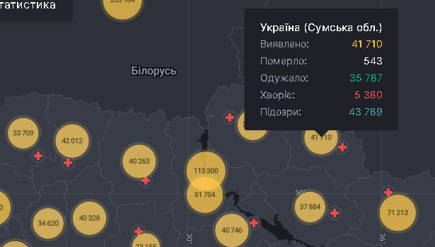 Як повідомляє система моніторингу поширення епідемії коронавірусу РНБО України, на Сумщині станом на 9:00, 6 січня, виявлено 41710 випадків COVID-19, з них +115 за останню добу. 35787 пацієнтів одужало (+377 за добу), 5380— хворіє.